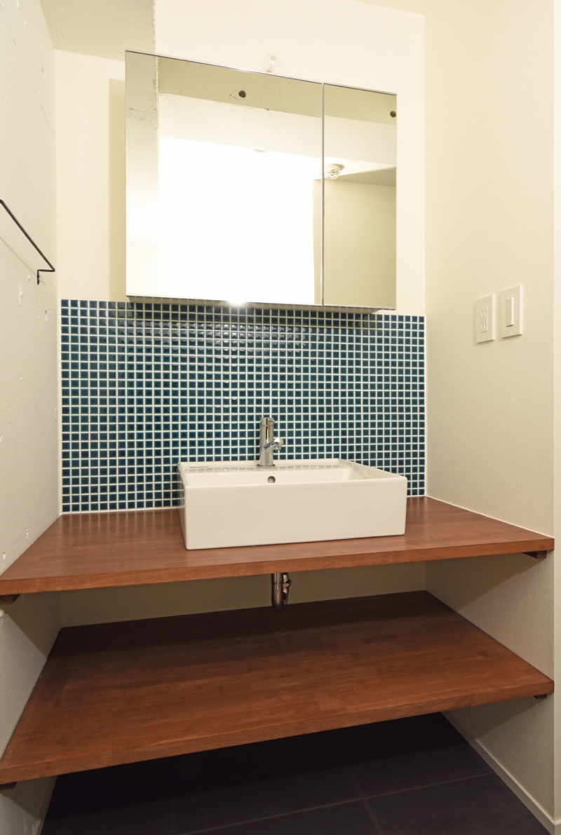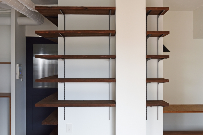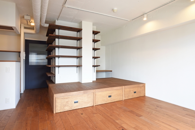 コンクリート打ち放し塗装とオイル塗装の棚のコラボ|マンションリノベーション|マンションリノベーション | 実例集 | リノベーション・新築施工はスタイリッシュリノ(StylishReno)にお任せ