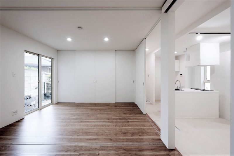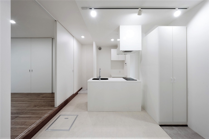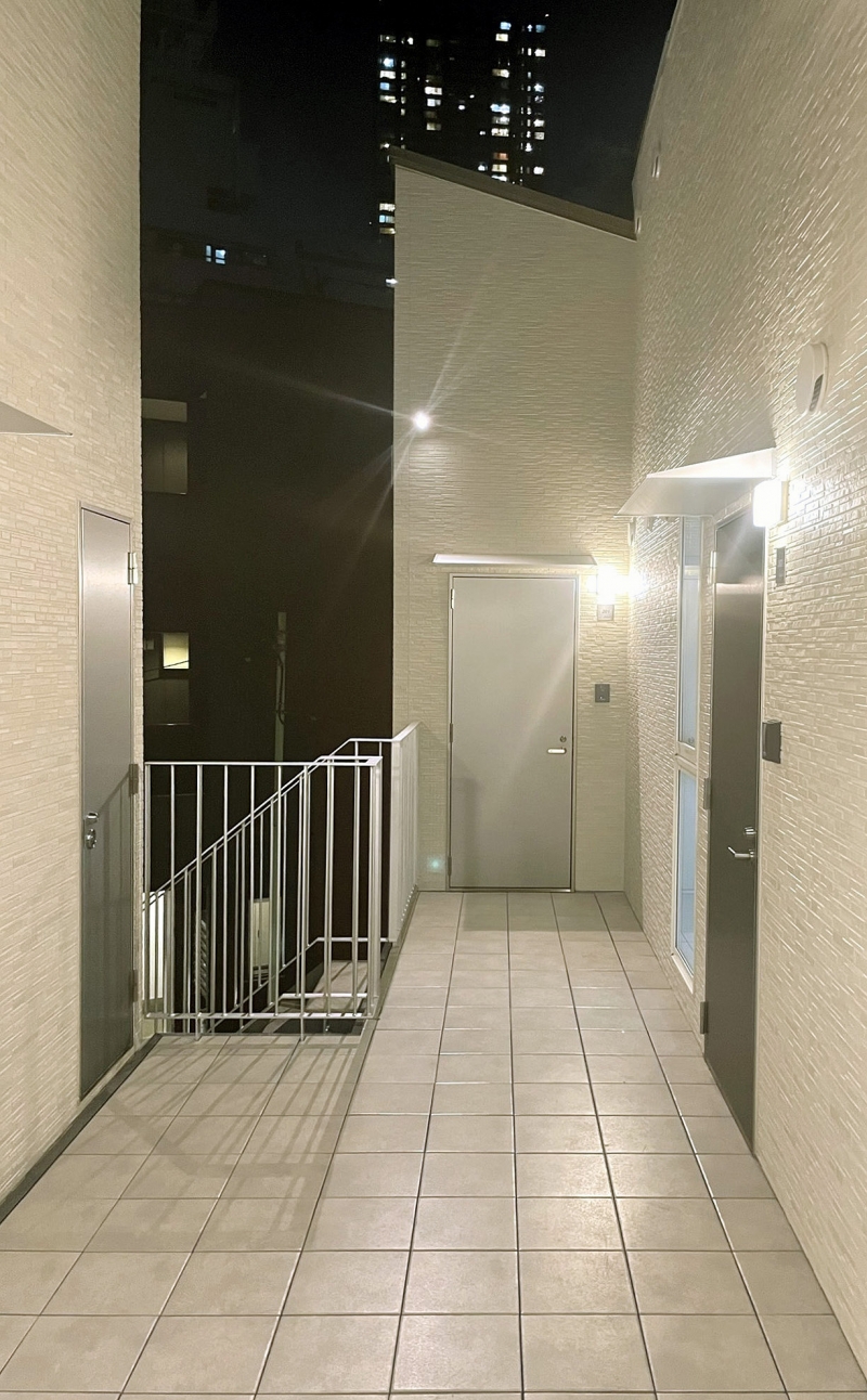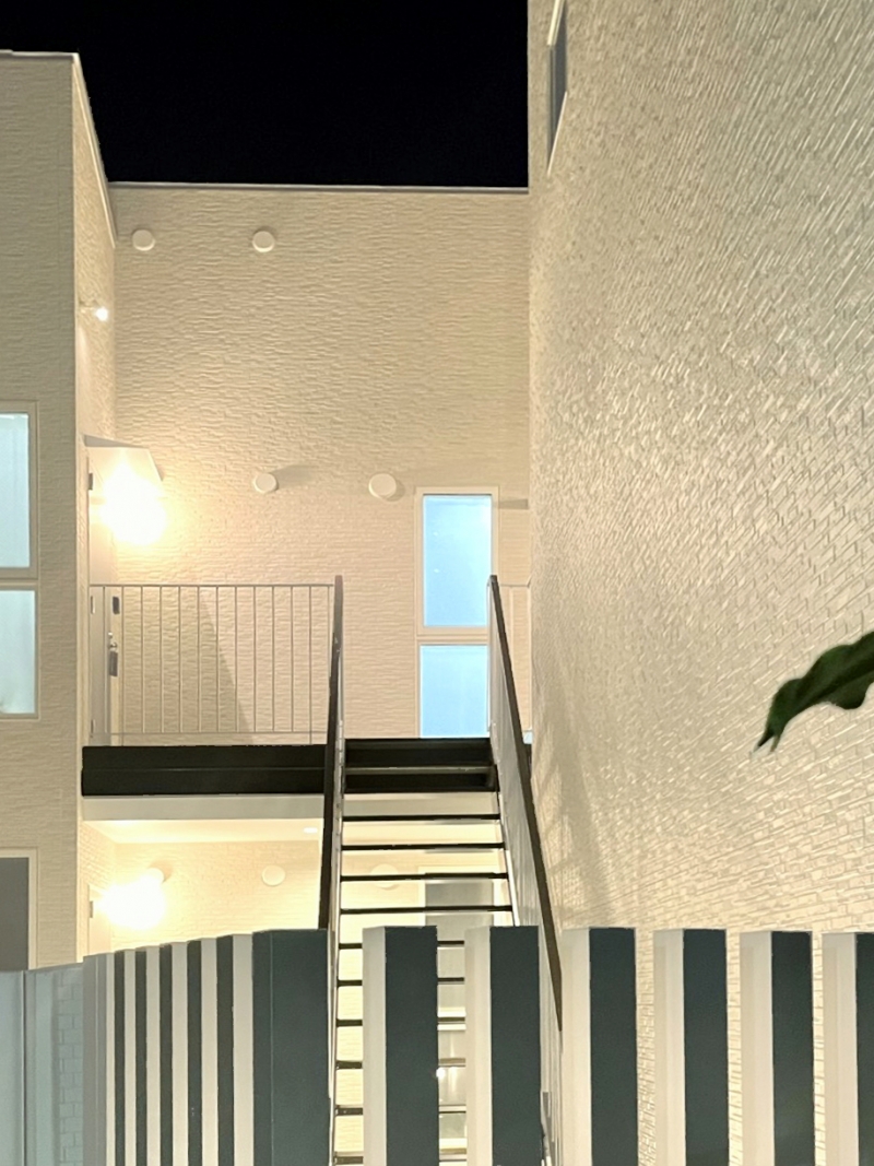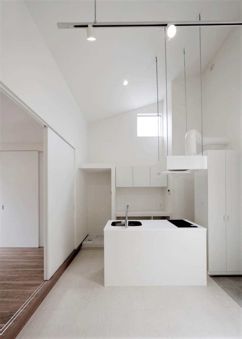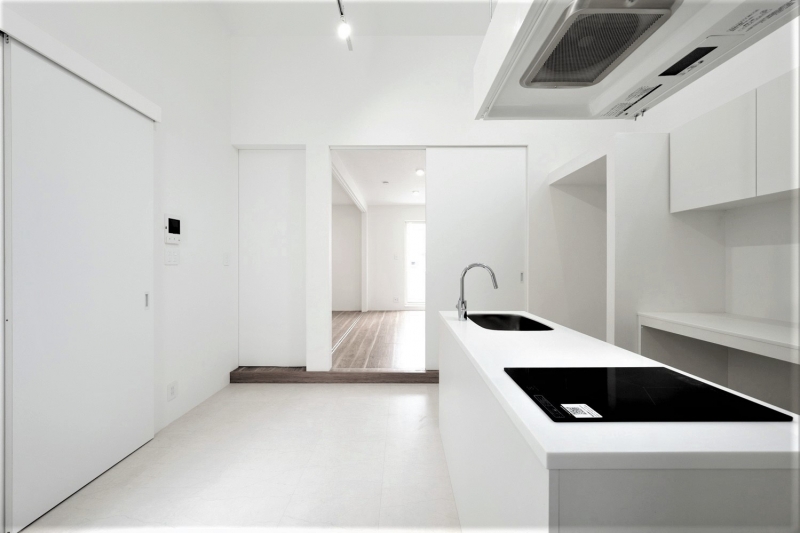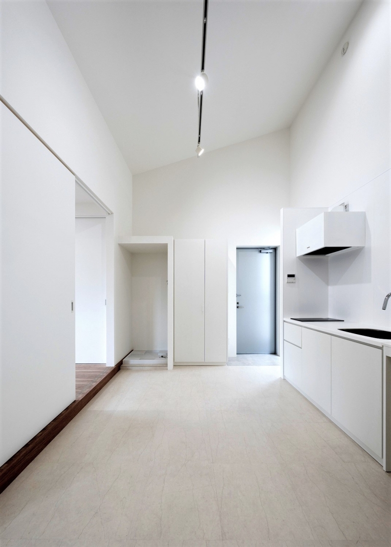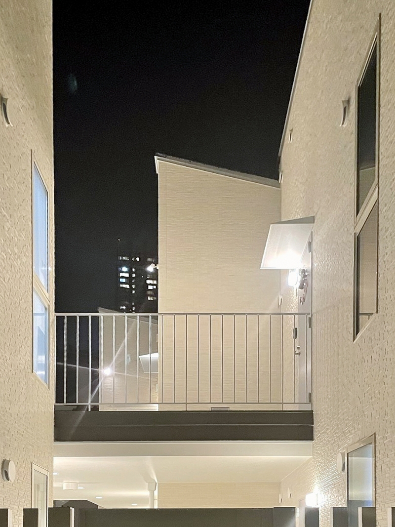 武蔵小杉のツーバイフォー工法のアパートです。インテリアは白を基調とし、壁付けキッチンとアイランドキッチン、フラット天井と吹上天井、パントリー、下足収納の配置のバリエーションによって様々な表情を創出しています。外部空間では2階デッキプラザ床にフラットタイル工法を採用し、スチール手摺のメタリック塗装と共にサイディングの外壁にシャープさを与える事を計りました。